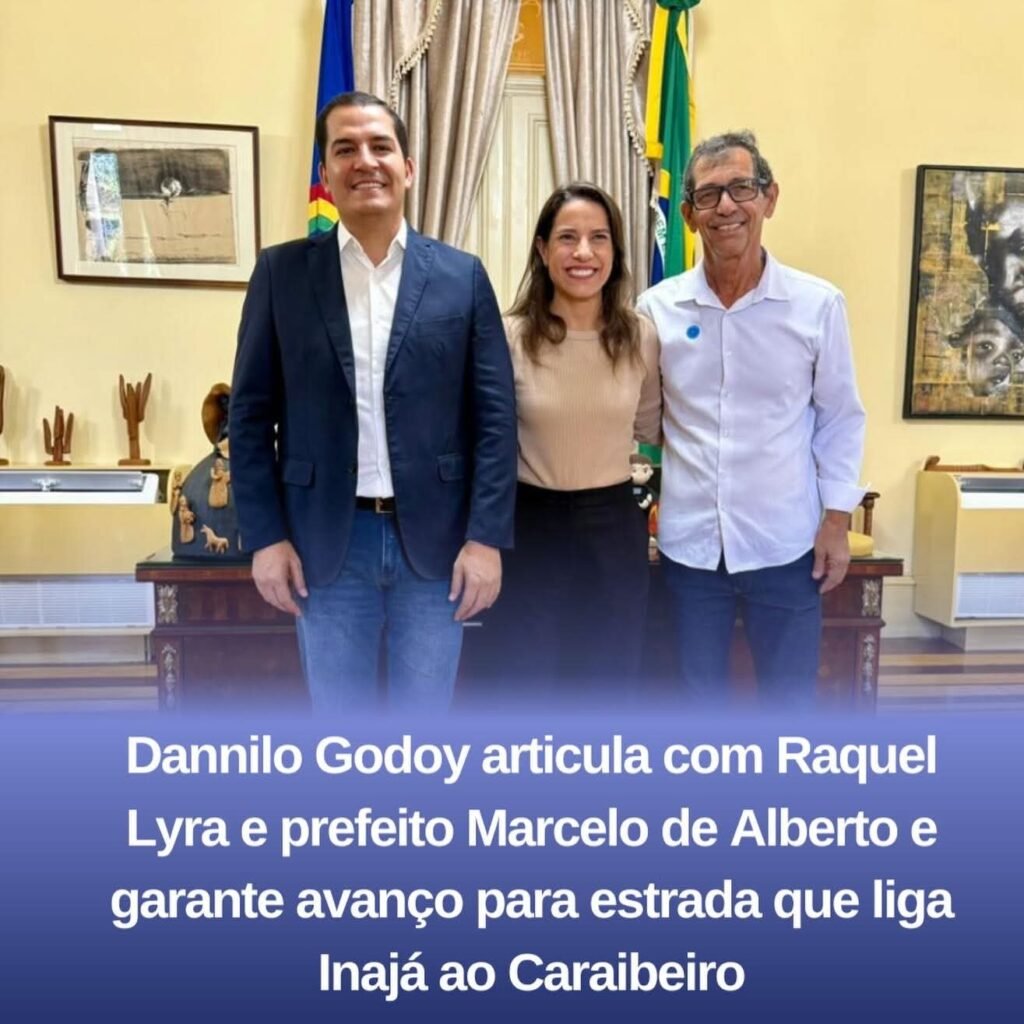 O deputado estadual Dannilo Godoy participou de uma importante reunião ao lado do prefeito de Inajá, Marcelo de Alberto, com a governadora de Pernambuco, Raquel Lyra, para tratar de uma das principais demandas do município: a estrada que liga Inajá ao distrito de Caraibeiro, que agora caminha para se tornar realidade.Durante o encontro, foram discutidos os encaminhamentos necessários para viabilizar a obra, que representa um avanço histórico para a mobilidade e o desenvolvimento da região. A estrada é uma reivindicação antiga da população e vai garantir mais segurança, acesso e qualidade de vida para os moradores da zona rural.Dannilo Godoy destacou a importância do diálogo e da união de forças entre o Governo do Estado e a gestão municipal. Segundo o parlamentar, a obra vai fortalecer a economia local, facilitar o acesso a serviços essenciais como saúde e educação e impulsionar o crescimento de Inajá.
