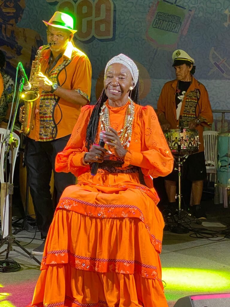 À medida que a noite avançava, a expectativa crescia para a apresentação da querida Lia de Itamaracá. Com seu carisma inigualável e suas canções marcantes, ela não apenas entreteve, mas também conectou as pessoas através da tradição do maracatu, da ciranda e do frevo. Cada nota e cada passo eram uma verdadeira ode à cultura local, fazendo com que o público se entregasse completamente à festa.