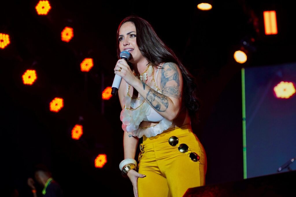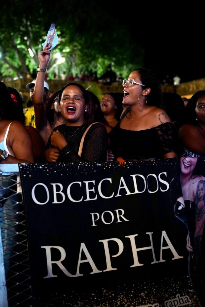 Às 22h30, foi a vez de Raphaela Santos colocar sua marca na noite com repertório marcado pela autenticidade do brega e pela emoção que atravessa suas canções. Artista em ascensão no cenário nacional, Raphaela tem reforçado sua presença com lançamentos recentes como o álbum After da Favorita (2025) e singles de grande repercussão, incluindo “Pense O Que Quiser de Mim” e “Aceita Meu Tchau (DJ Verdelho Remix)”, que refletem essa fase de consolidação e experimentação estética dentro do universo do brega romântico e dançante. O show trouxe ao público um repertório que combina intensidade afetiva e batidas contagiantes, evidenciando seu lugar de destaque na cena do brega.